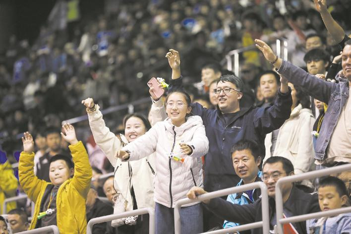 2025年12月20日晚,沧州体育馆的穹顶几乎要被这声浪掀开。看台上,一片跃动的蓝色海洋中,39岁的时运把3岁的儿子扛在肩头,13岁的女儿时叆雨珊则用力挥舞着一面印有沧州队队徽图案的旗帜,和他们熟悉的“狮兄弟”球迷会的数百名伙伴一起,忘情呐喊。