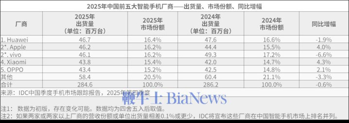 其中,华为以46.7百万台出货量、16.4%市场份额居首,较2024年(47.6百万台、16.6%份额)同比微降1.9%;