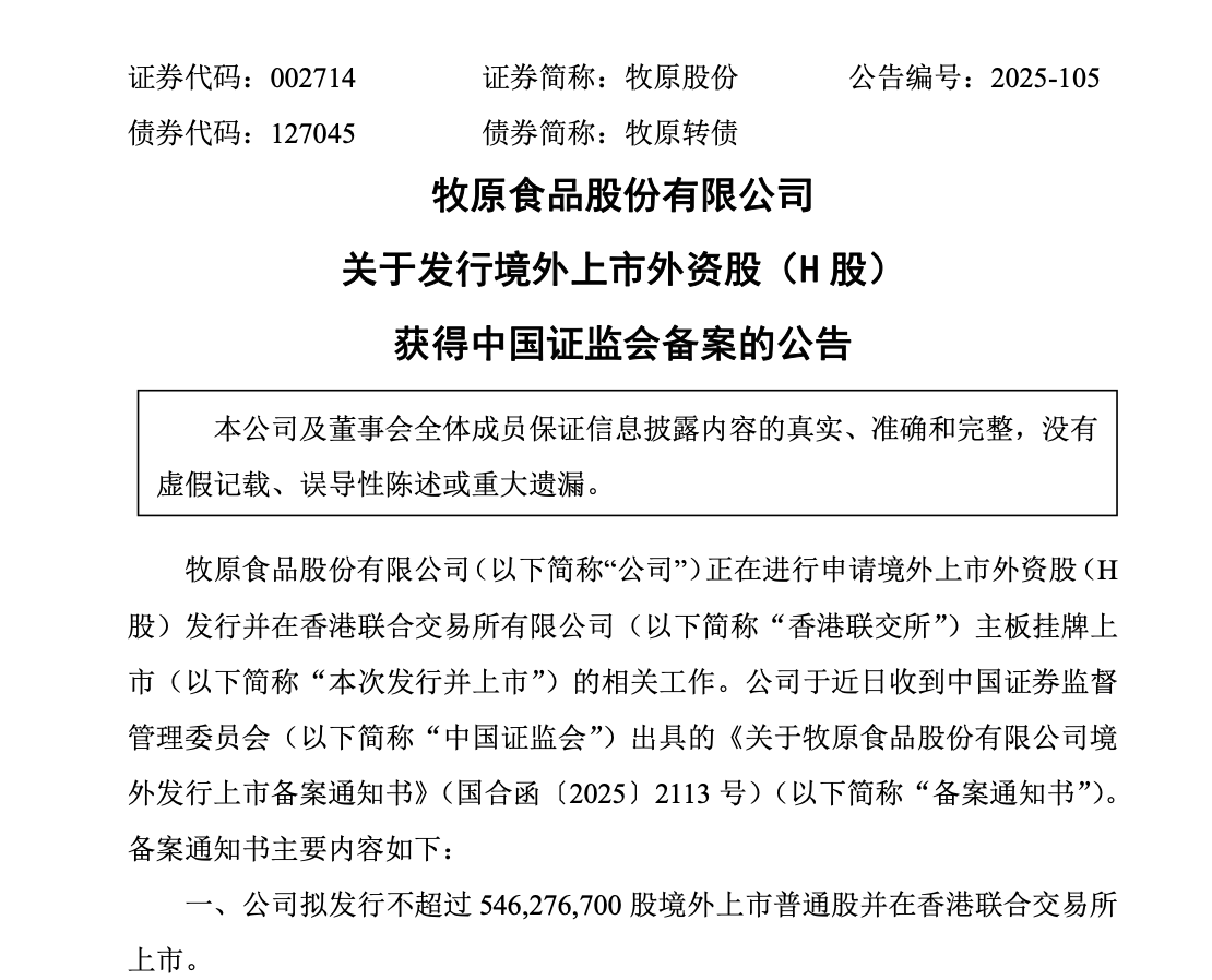 牧原股份11月27日晚间公告,已正式获得证监会出具的《境外发行上市备案通知书》,拟发行不超过546,276,700股境外上市普通股股H股并在香港联合交易所(简称“香港联交所”)主板上市,该备案标志着公司赴港上市进程取得关键进展。